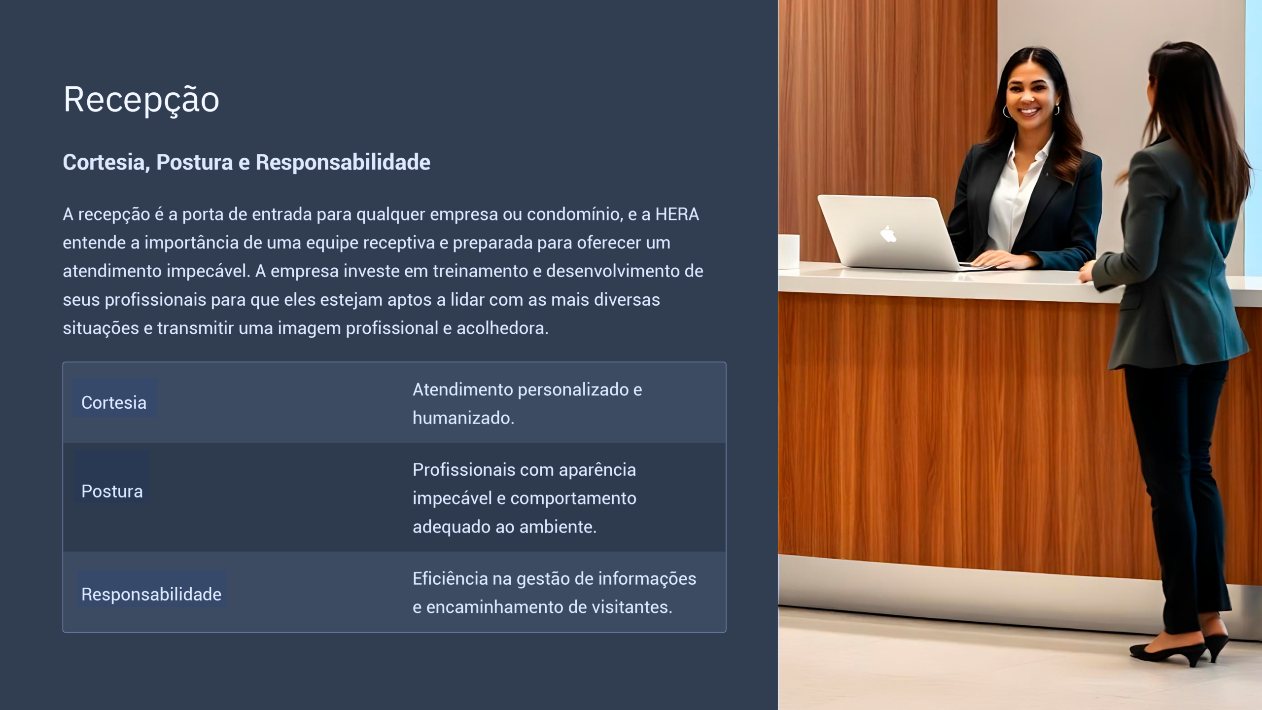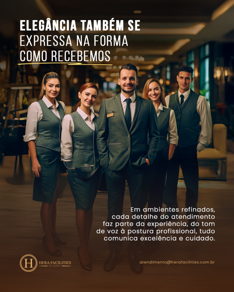A Hera Facilities oferece profissionais preparados para atender com cortesia, postura e responsabilidade, alinhados ao padrão e à cultura do seu ambiente.
