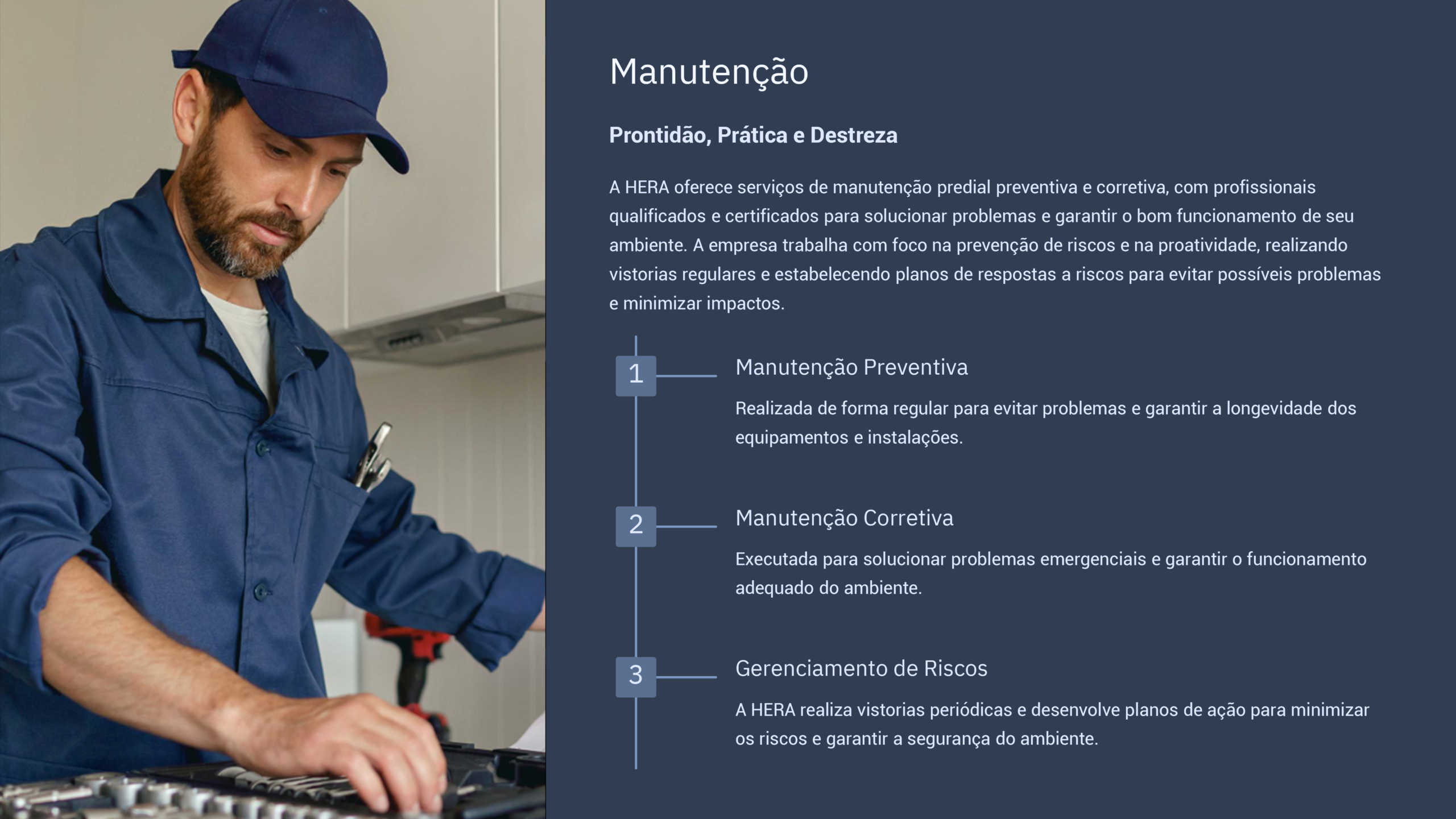 A Hera Facilities atua com manutenção preventiva e corretiva, executada por profissionais certificados, garantindo segurança, continuidade e preservação do patrimônio.